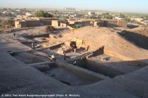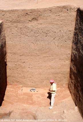 Grabungsstelle BDr. Jörg BeckerGrabungen am West-Palast Anschließend erfolgte im Rahmen der Neugrabungen die Freilegung der prähistorischen Schichten. Allerdings zeigte sich, dass an dieser Stelle die prähistorische Bebauung wesentlich tiefer lag, als zuvor angenommen und massive Auffüllungen den eisenzeitlichen Baugrund nivelliert hatten. Erst rund 4,50 m unterhalb des eisenzeitlichen Begehungsniveaus konnte mit Rundbau 1 ein Halaf-zeitliches Gebäude zur Hälfte erfasst werden. Die Mauern des im Durchmesser ca. 6,5 m großen Gebäudes bestehen aus Lehmziegeln und weisen auf der Außen- und Innenseite Verputzreste auf. Im Inneren ist der Bau durch abgehende Binnenmauern in einzelne Räume untergliedert (Abb. 2). Zu den wesentlichen Erkenntnissen dieser Untersuchungen gehört die Feststellung, dass wir mit den neuen Ausgrabungen in eine Senke zwischen zwei prähistorischen Kuppen geraten sind und der Schichtaufbau in prähistorischer Zeit keineswegs so horizontal geschichtet verlief, wie es die Berichte aus den Altgrabungen vermuten lassen. |